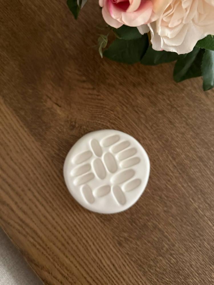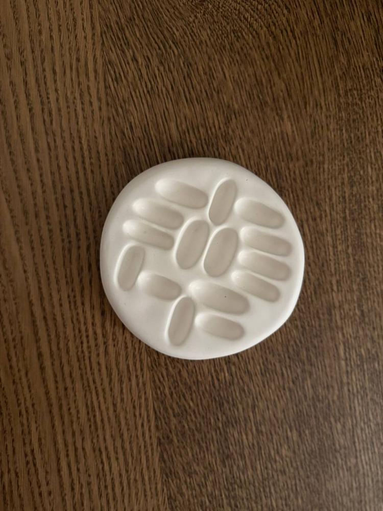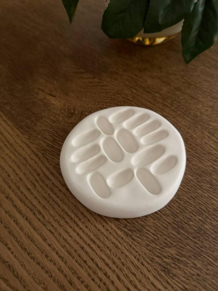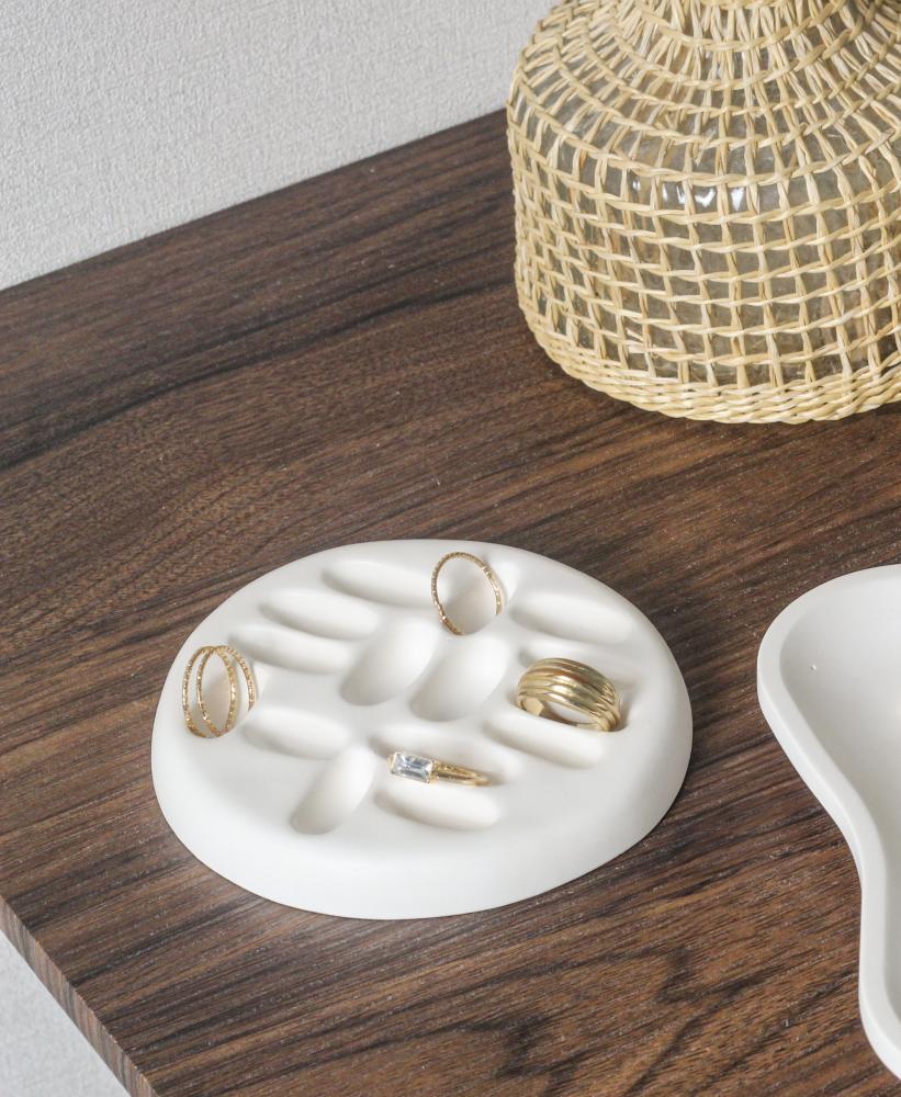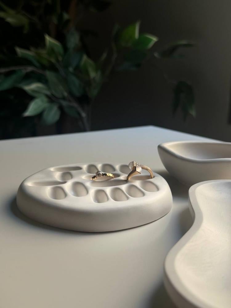 - تصميم دائري مسطّح مع حفر بيضاوية متناسقة تناسب الخواتم، الأقراط والإكسسوارات الصغيرة.